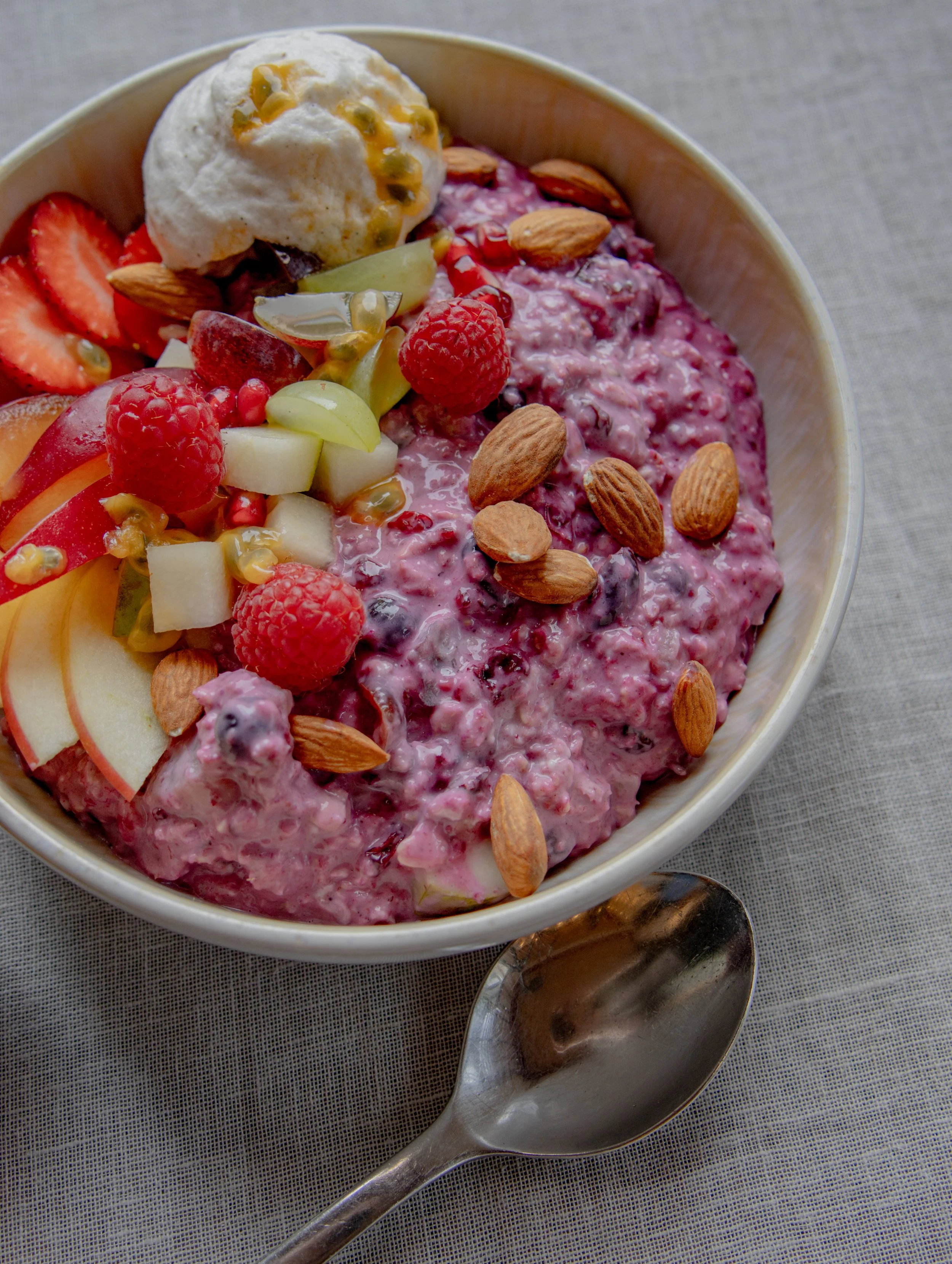 mit Sojajoghurt, Haferflocken, Apfel, Himbeeren, Kokos-Espuma, geröstete Mandel & frischen Früchten