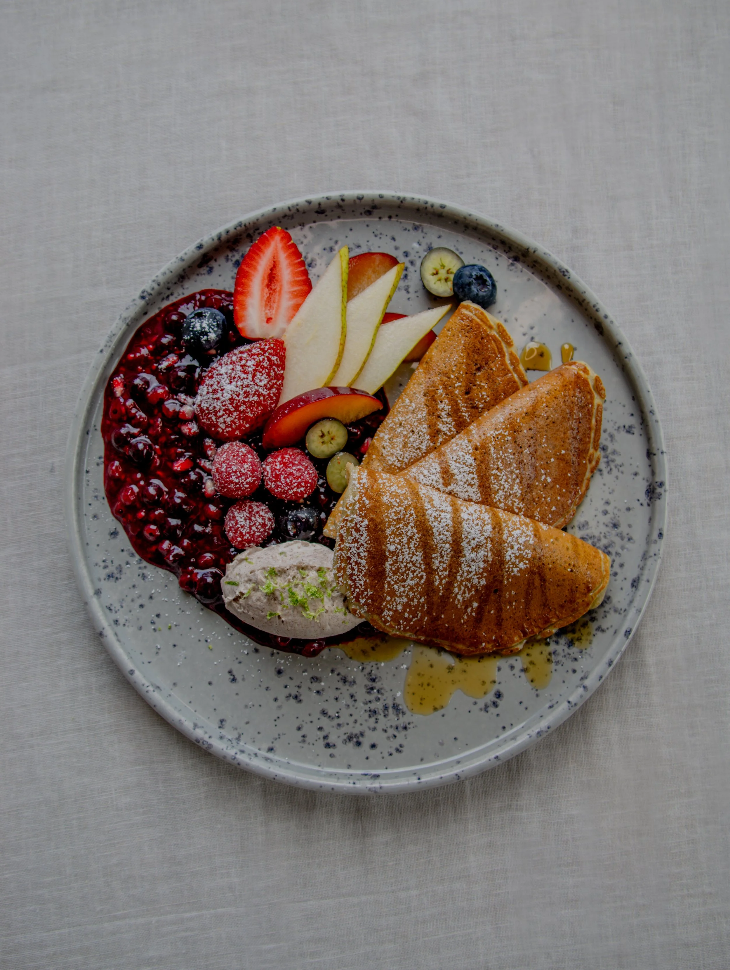 mit hausgemachtem Beeren-Kompott, Limetten-Mascarpone-Creme, Früchten & Ahornsirup - wer mag mit Schoko +2,00