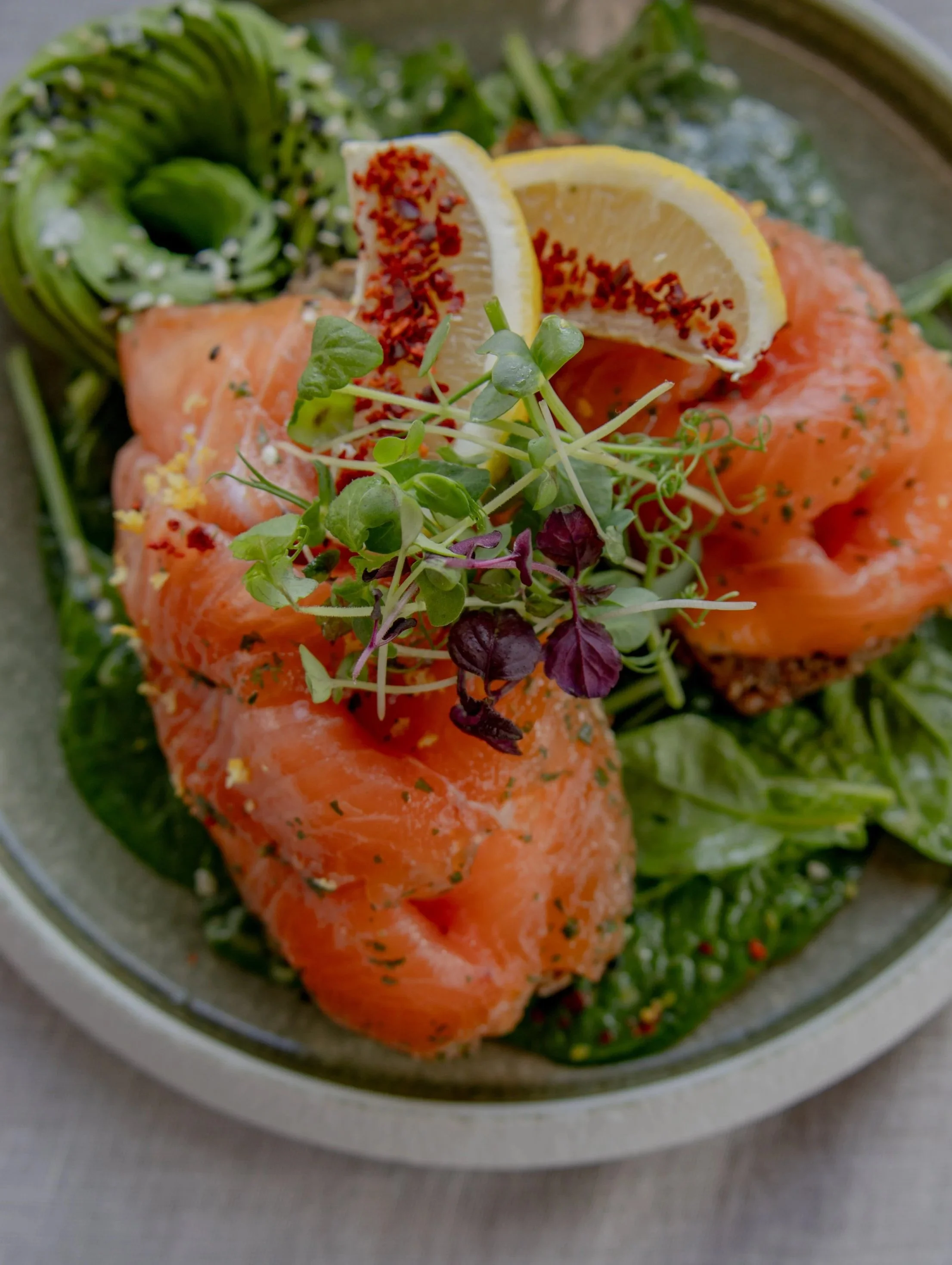 hausgebeizter Lachs auf Vollkorn-Sauerteigbrot mit Hüttenkäse, eingelegten rote Zwiebeln, Babyspinat, Sesam, Zitrone & Honig-Senf-Dip